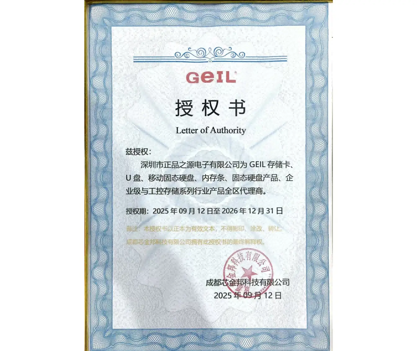正品之源荣获GEIL(台湾金邦 ) 授权